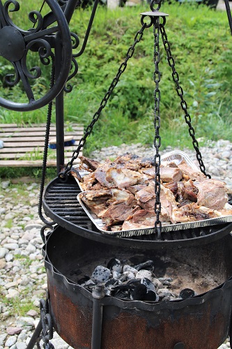 Po spacerze przyszedł czas na degustację – dla najodważniejszych żętyca, a dla wszystkich oscypki, gołki, korbacze i przepyszny, jeszcze lekko ciepły i słodziutki bundz. Potem przyszła pora na danie główne czyli baraninę z grilla, marynowaną w czosnku i przyprawach dzień wcześniej. Zakończyliśmy ciastem drożdżowym z borówkami i z pełnymi brzuchami wjechaliśmy kolejką na Kotelnicę rozkoszować się widokami i słońcem.