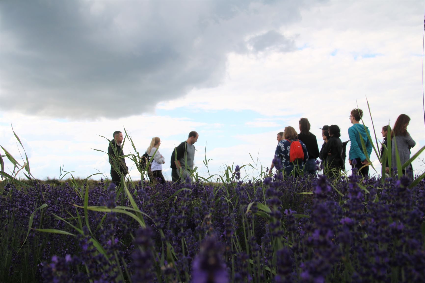 Ostatnim punktem programu była wizyta u Ani i Michała z Lavendziarni Stoki 6, którzy specjalnie na nasze odwiedziny zostawili część kwitnącej lawendy na polu. Z gospodarstwa rozciąga się przepiękny widok na okolicę, co być może choć trochę umila trudną pracę przy plewieniu i zbiorach. Kwiaty szczególnie upodobały sobie trzmiele, których brzęczenie było tłem do opowieści Michała o historii i właściwościach lawendy. Ania ucięła nam lawendowe bukiety do ususzenia lub wypicia w formie herbatki (gospodarstwo ma certyfikat ekologiczny i przetwarza lawendę przede wszystkim na cele konsumpcyjne), a Michał opowiadał o produktach (lawendę przerabia m.in. na syropy i hydrolaty) i częstował lawendową lemoniadą. Po tak aromatycznej wizycie całkowicie odprężeni udaliśmy się w drogę powrotną do Podgórza.