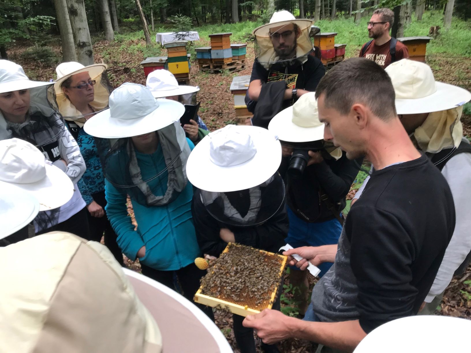 Przy ciekawych rozmowach czas szybko mija, ale w miarę jak do Ojcowa zaczęli napływać odwiedzający z Krakowa, my już udaliśmy się na spotkanie z Lidią i Mateuszem, właścicielami Pasieki Morawskich. Po przyjemnym spacerze przez las dotarliśmy do pasieki, w której pszczoły zbierają teraz spadź. Każdy dostał kapelusz pszczelarza (tylko Mateusz się nie bał, co widać na zdjęciach), obejrzeliśmy ule z bliska, trzymaliśmy ramki z pszczołami w ręku, głaskaliśmy trutnie, szukaliśmy królowej a na koniec jedliśmy ciepły miód prosto z ula, wycinany przez Lidkę z plastra. Smak ciepłego chleba zna każdy, ale ciepły miód to naprawdę coś wyjątkowego! Z innych ciekawostek ule mają pod spodem wagi, więc w aplikacji można sprawdzać na bieżąco, ile miodu nazbierały pszczoły. Pytaniom nie było końca, byliśmy tak ciepło przyjęci przez gospodarzy, że żal było wyjeżdżać, ale musieliśmy ruszać dalej.