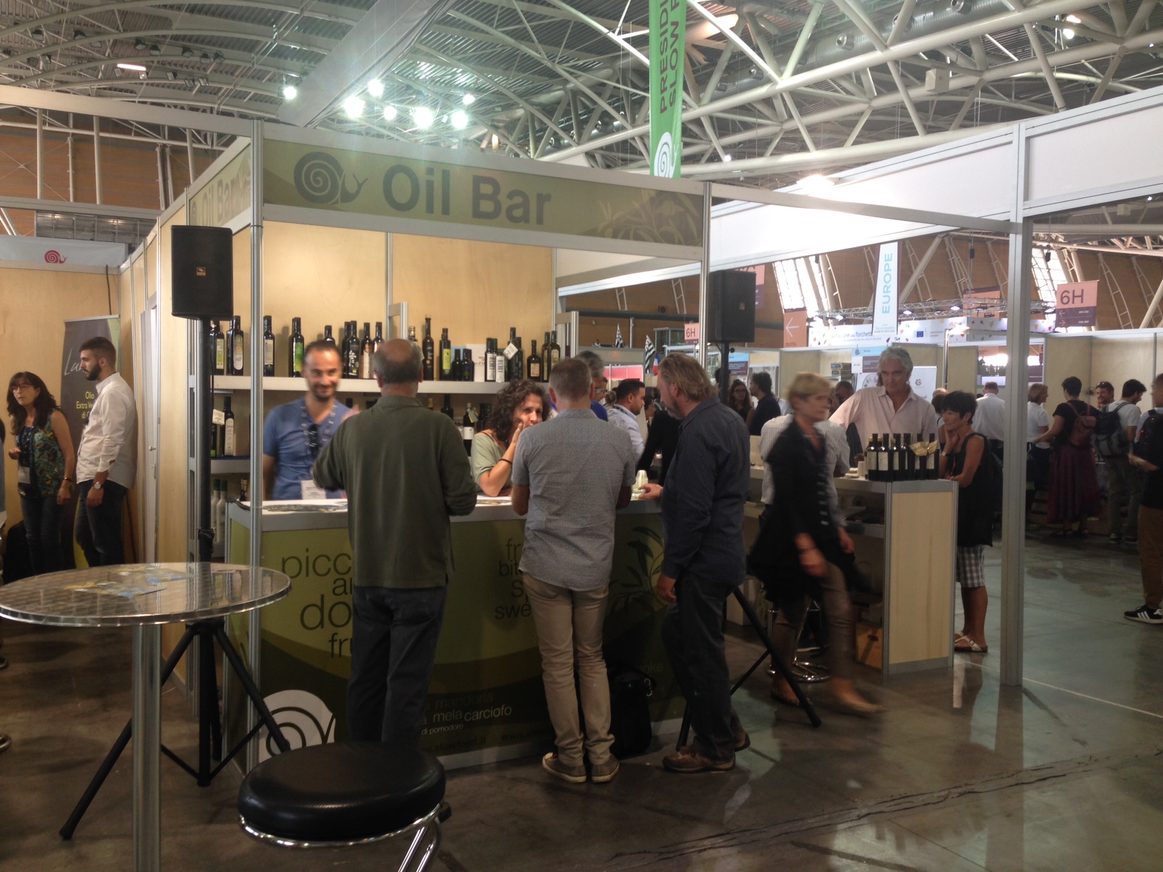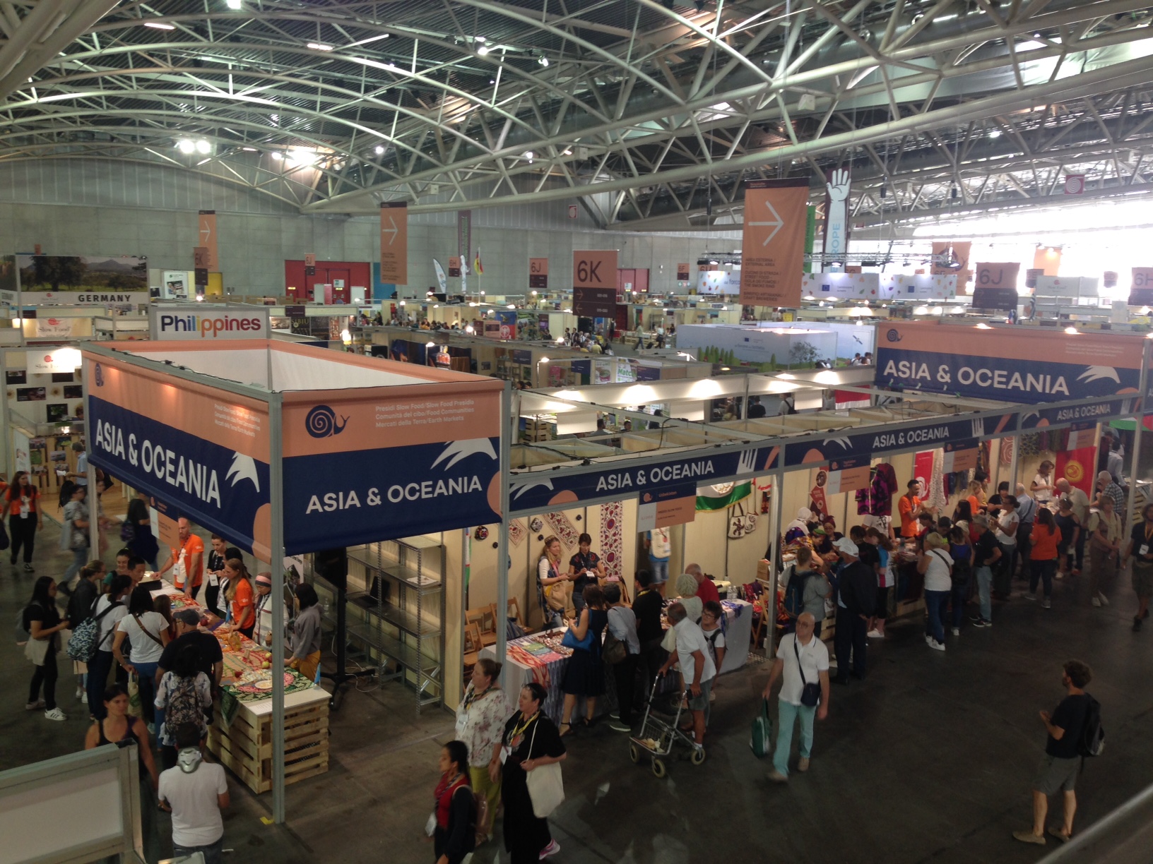 Jeżeli o jedzeniu mowa to nie można nie wspomnieć choćby o kilku produktach – najciekawszą wydała mi się hala Oval gdzie prezentowały się narodowe stoiska z całego świata oraz Prezydia Slow Food. W Ovalu można było znaleźć m.in. bar oliwny, za którym barman nalewał nam do kieliszków degustacyjne porcje oliwy z oliwek do smakowania. Wzrok przyciągały piękne kolorowe stroje przedstawicieli z Mozambiku, minimalistyczne kimona w pawilonie japońskim i postawny brodaty Niemiec na stoisku z wędzonym czosnkiem, który każdą sprzedaż anonsował biciem w zawieszony nad stoiskiem dzwon.