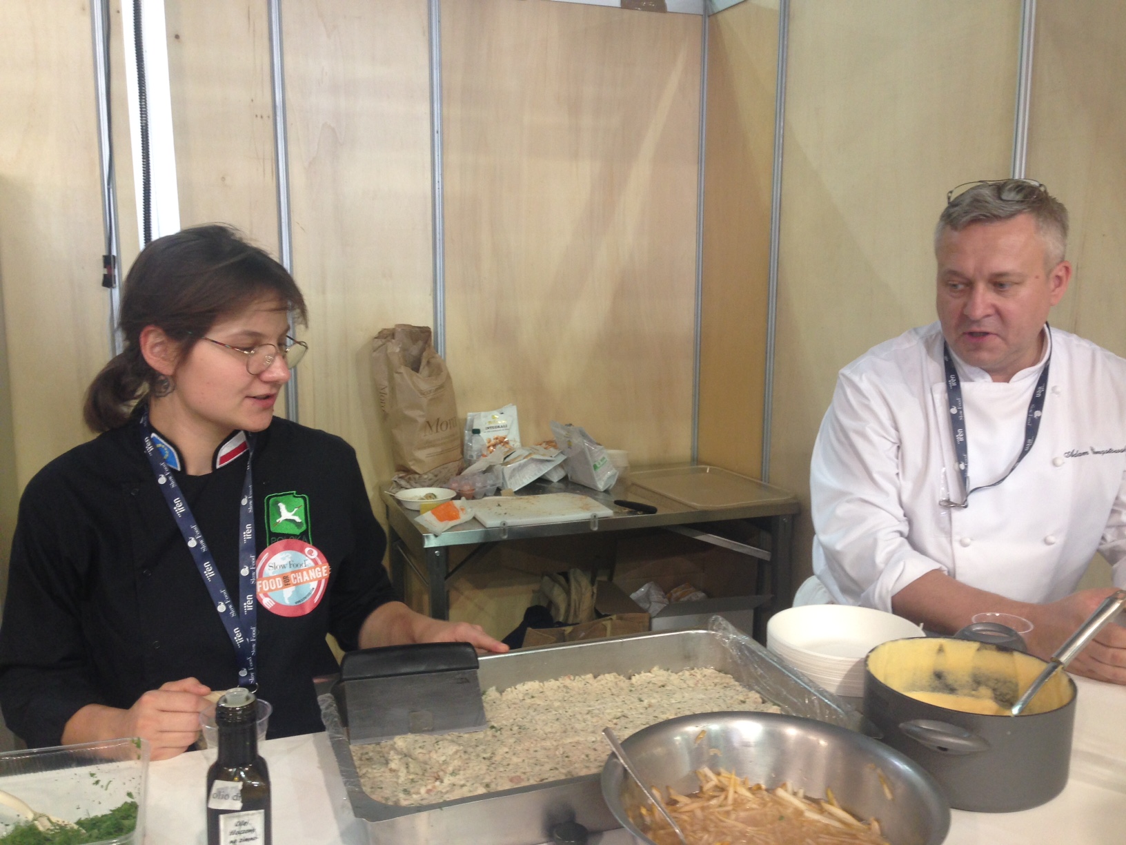 Program Terra Madre to dosłownie setki wydarzeń – degustacje, kolacje, laboratoria smaku, panele dyskusyjne, pokazy kulinarne i wiele, wiele innych. W ramach projektu Terra Madre Kitchen kucharze z poszczególnych krajów przygotowywali dla uczestników dania swojej narodowej kuchni. I tu nie zabrakło akcentu polskiego – dzięki współpracy ze świetnym zespołem z Urzędu Miasta Krakowa, związana z naszym targiem szefowa kuchni Paulina Gulajska przygotowała wraz z szefem Adamem Chrząstowskim kultowego już pstrąga ojcowskiego od Agnieszki Sendor i jej mamy, sałatkę z gruszki, popping gryczany i zabaione na basie destylatu gruszkowego od Krzysztofa Maurera.